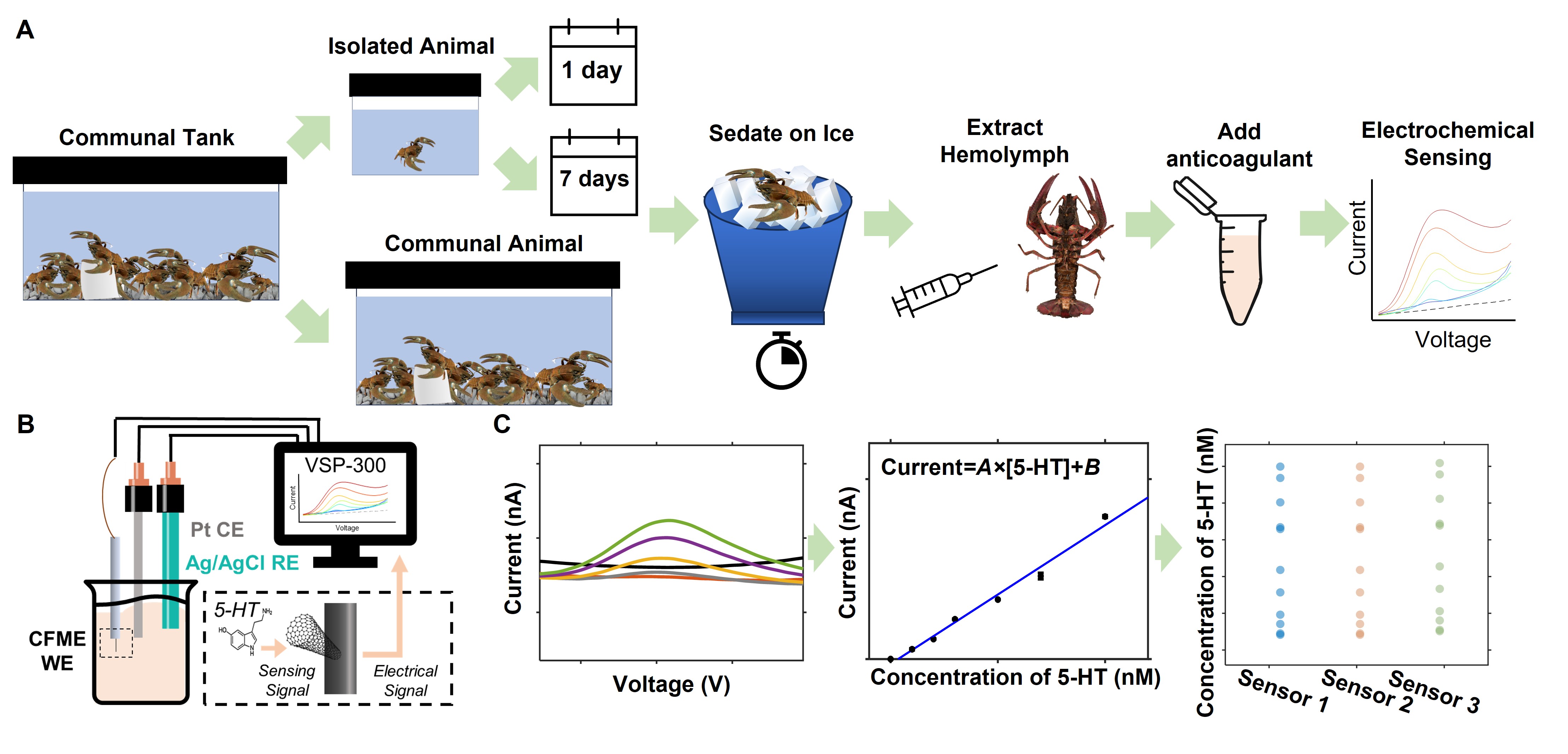 Serotonin affects behavior and mood. In crayfish, levels directly affect conditions like anxiety and behaviors like aggression and social dominance. The crustacean species make a great subject for hormone-behavior studies because they have a reduced nervous system, identified serotonin-producing neurons, and known links between serotonin levels and behavior. However, it is extremely difficult to measure serotonin in them because their concentrations of the neurotransmitter are low and many other chemicals interfere with detection. Previous electrochemical sensors could not reliably measure naturally occurring levels of serotonin and often required injecting serotonin to get a readable signal.